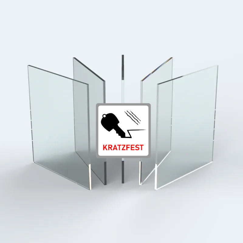 Unsere kratzfesten Polycarbonat-Platten sind in 3, 5 und 8 Millimetern Stärke erhältlich. Diese Auswahl ermöglicht es Ihnen, das passende Material für Ihr Vorhaben zu finden. Ob dünne Platten für leichtere Anwendungen oder dickere Zuschnitte für besonders robuste Projekte – mit unseren transparenten und kratzfesten Polycarbonat-Platten setzen Sie auf ein Material, das gleichermaßen mit seiner Langlebigkeit, Flexibilität und Ästhetik überzeugt.